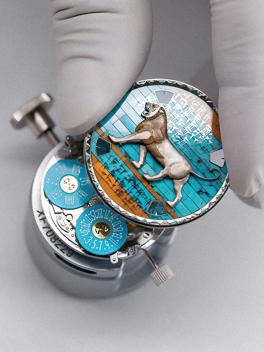 The movement within the Lion de Darius is the self-winding Calibre 2460 G4/2, developed and manufactured entirely in-house by Vacheron Constantin. Its clever architecture dispenses with traditional hands, instead using four rotating discs to indicate hours, minutes, days, and dates through peripheral windows. This innovative layout creates an unobstructed canvas for the dial’s artistry while reinforcing the seamless marriage of technical ingenuity and cultural storytelling. The case back, visible through sapphire crystal, reveals a 22K gold oscillating weight engraved with the Louvre’s eastern façade, a quiet reminder of the collection’s museum partnership and the scholarly rigor behind its conception.